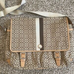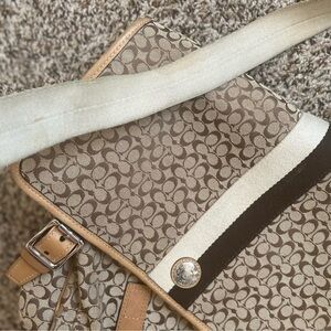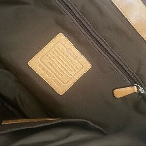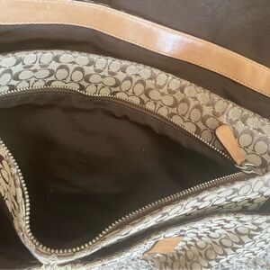 Elegant Coach bag with black fabric and tan leather trim. Features a zippered pocket and signature label.stain on handle have been wear