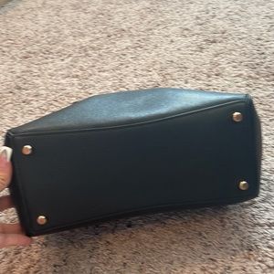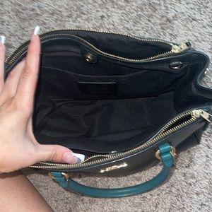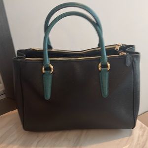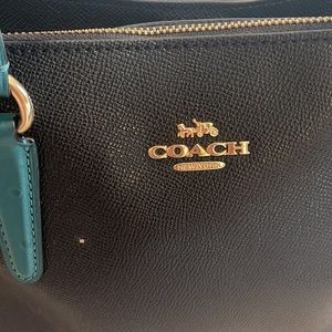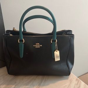 Elegant black satchel with teal handles. Gold-tone hardware. Signature Coach logo.