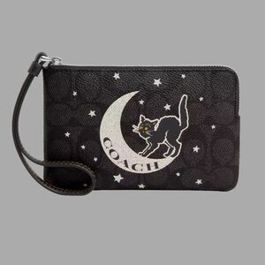 Stylish Coach wristlet. Features a black cat and moon design. Includes a convenient wrist strap.