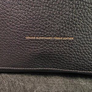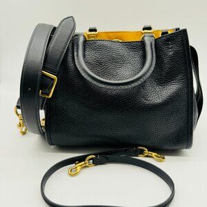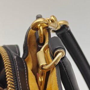 Elegant black leather handbag with striking yellow interior. Features dual handles and detachable shoulder strap. Gold-tone hardware accents. No hang tag,missing one short strap