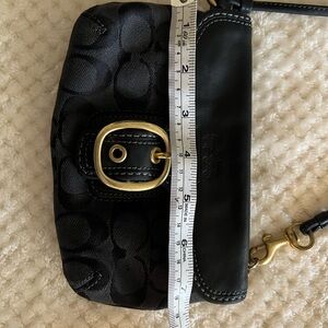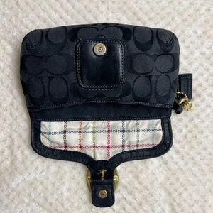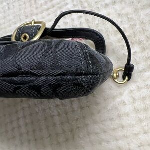 🩷 This Coach Bleecker Signature Black Canvas Leather Trim Buckle Wrislet is a stylish and functional accessory for any woman. The buckle closure provides a secure fit, while the leather lining material adds a luxurious touch. The exterior color is black and the model is Coach Bleecker. The exterior material is canvas and the handle/strap material is also canvas. Light wear on hardware, light rubs clean inside Good Condition