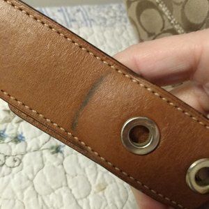 Fabric is in very good condition, there is a tiny fray spot beginning at one corner. Leather shows patina with some marks or discoloration. Strap edge clean and intact, scratch on the underside, marks where the strap has been set. Lining is quite clean, some light marks.