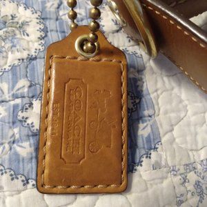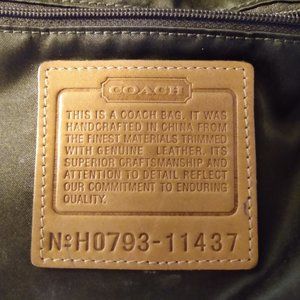11437. Bag is in very good used condition. Brown and tan signature jacquard, tan leather trim and accents, chocolate sateen lining, brass tone hardware, hang tag. Unzips to single compartment. One inner zip lining pocket, two inner slip (divided) pockets. Convertible strap to wear as shoulder or cross body. No dust bag.