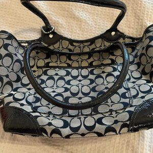 Gray bag with black Coach signature design, shiny leather handles, shiny leather black patches on botton, plaid colorful silk interior, pocket on exterior and pockets inside, used but in great condition, comes with Coach dust bag