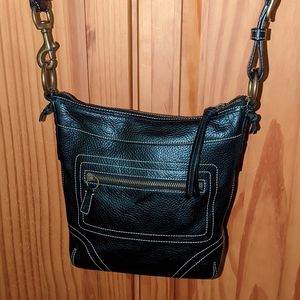 Vintage Coach Bleecker duffle crossbody bag. Pebbled leather with brass hardware and stiching details. One zip pocket on front. Zipper closure. One zip pocket inside and two slip pockets inside. By Coach stamped on back. Bag is in very good pre-owned vintage condition. Only small dent on leather on front as shown in the picture. 9.5"-9"-2.5"