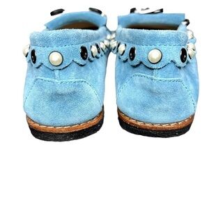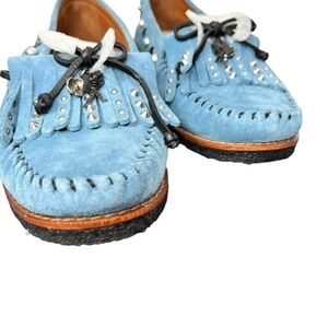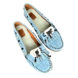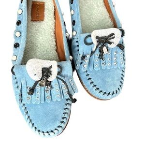 Coach Blue Chambray Roccasin Slip On Western Fringe Charm Sherpa Lined Mule Flat Loafer Size 11