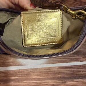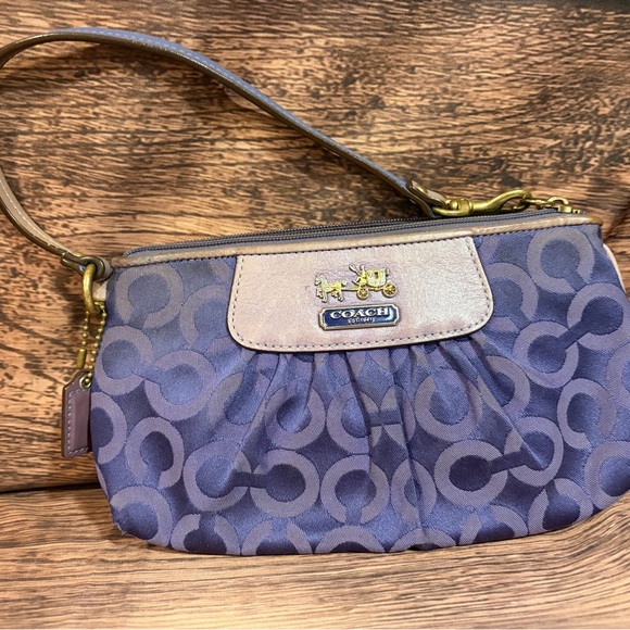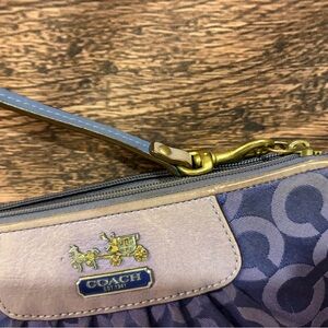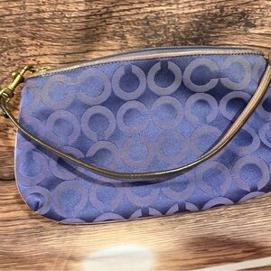 Chic Coach clutch with a striking blue pattern. Features a wristlet strap for easy carrying. Ideal for adding a touch of elegance.