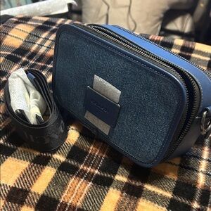 Stylish Coach crossbody with denim front. Features blue accents. Perfect for daily wear.