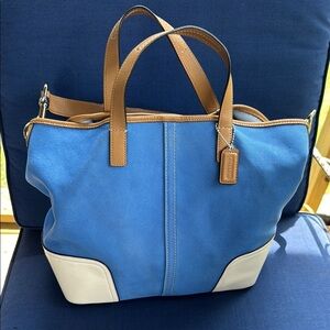 This elegant Coach tote features a vibrant blue suede body paired with tan leather handles and trim, creating a chic and versatile accessory. Its spacious and structured design is perfect for carrying essentials, while the reinforced corners add both style and durability.