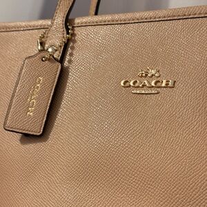 Classic Coach tote crafted from pebbled leather in a soft beige/blush neutral. A versatile everyday and work-ready bag with a clean, timeless silhouette.