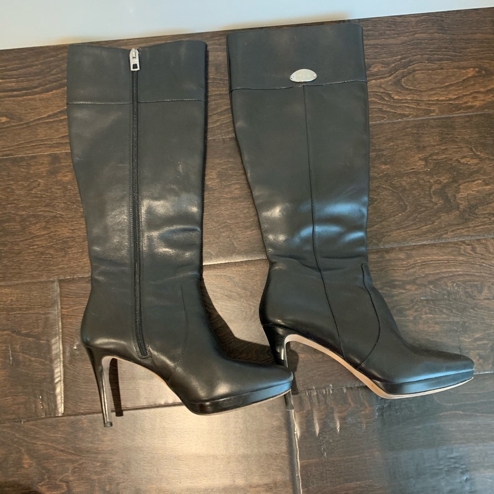 Black leather heeled over-the-knee boots by COACH. All signs of wear (minor scuffing) is pictured.