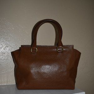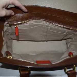 Coach Brown leather satchel with orange accents, no feet. Measurements: 13.5" L x 11" x 5" D. Handle drop: 7". Interior pockets: 2 slip, 1 zip. Outside pockets: 1 slip, 1 zip. Zip closer.