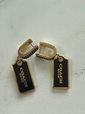 Three heart charms dangle from delicate chains. One heart is crystal-lined for sparkle. One heart features an open filigree design. Small engraved heart tags show the Coach logo. Feminine and elegant drop style.
