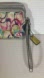 Large middle pocket with zipper & credit card pockets / 1 outside zippered pocket/ 1 slip in outside pocket / yellow hang tag / silver accents / authentic / small stain inside middle pocket / matching purse in closet / 8” long x 4 1/2” tall x 3/4” wide