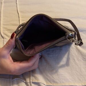 Elegant Coach wristlet with a bronze shimmer. Ideal for evening events.