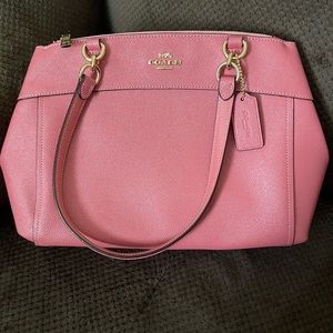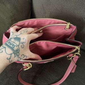 Coach Brooke bag is like new. It’s a beautiful pinky mauve sparkly color has a main opening in the middle that is magnetic and two zippers on the top also has slip pockets and a smaller zipper on the inside big enough to hold all your essentials. This is a beautiful bag. LIMITED EDITION COLOR