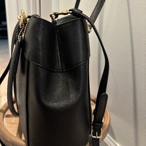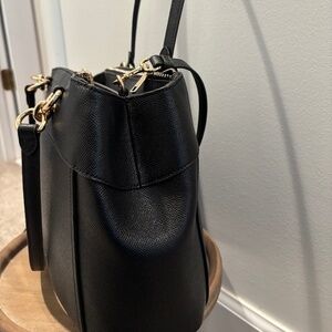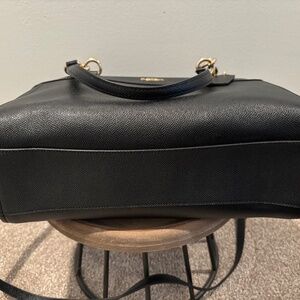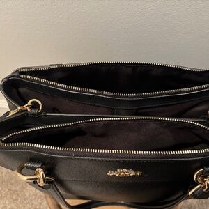 Coach large Brooke Carryall shoulder / crossbody bag in black crossgrain leather. Detachable shoulder strap with 22 inch drop. Black fabric lining, cell phone pockets and snap closure connecting two zipper compartments. Great condition!