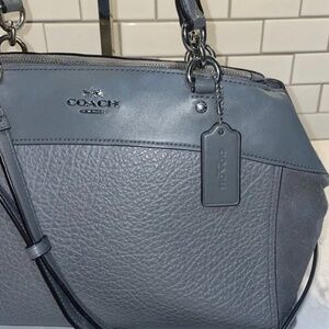 Coach Brooke Carryall Grey Buffalo-embossed leather, smooth leather and suede Inside cell phone and multifunction pockets Snap closure, fabric lining Side zip compartments Handles with 8 3/4" drop Detachable strap with 22" drop for shoulder or crossbody wear 12 1/2" (L) x 8 1/2" (H) x 4 1/4" (W) Style No. F31418
