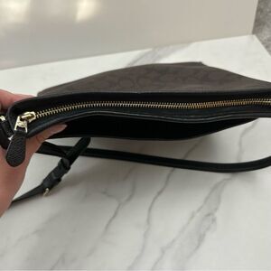 This is a brown and black coach crossbody messenger bag