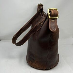 This is a gorgeous true vintage Coach Brown Duffle Feed Sac Shoulder Bag XL F7D. Good pre owned condition. scuffs scuffs and some darkening. Some spots as shown. All the leather can be dyed a little darker to hide the darker spots x Brass hardware. Adjustable strap. Thick vegetable tanned glove leather. No odors. No tears. Approx 14”H x 15.5” x 9”D. adjustable stable strap on both sides. Strap length. 4 eyelets on each side. Strap drop: 15” at longest and 10.5” at shortest.