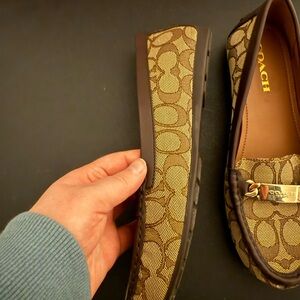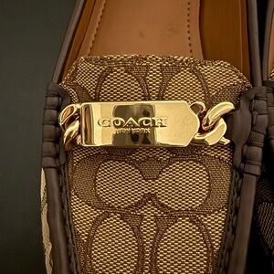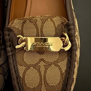 Experience the perfect blend of style and comfort with these Coach brown flats. Featuring the iconic Coach monogram print and a chic gold hardware accent, these loafers are ideal for both casual and business casual settings. The warm tan interior lining adds a touch of elegance to this versatile footwear. New without box.