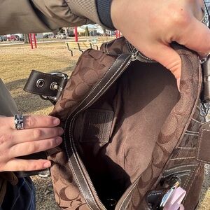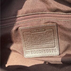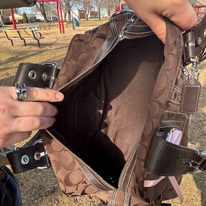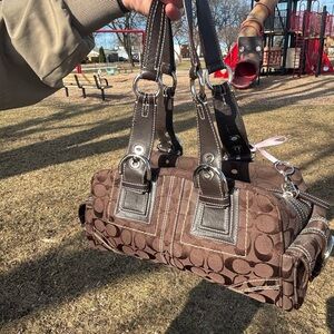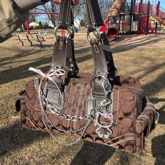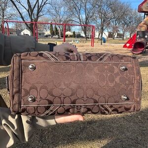 Stylish Coach handbag. Rich brown color. Silver chain details. Perfect for any occasion.