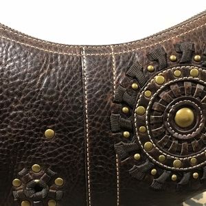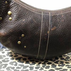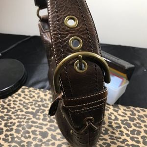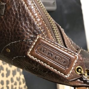 Small dark brown leather Coach bag with gold adornments. Bag shows some signs of wear shown in photos. The bag measures 7"deep. 12"wide. Strap is approximately a 9 3/4" drop.