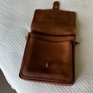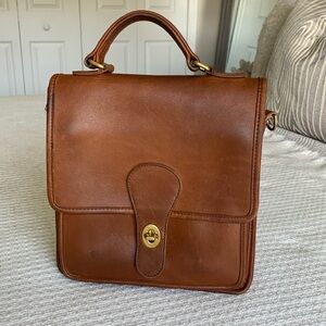 Elegant brown leather satchel. Features top handle and adjustable strap. Classic design with front flap closure.
