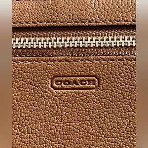 This versatile structured Coach leather piece can be used as a wallet or travel organizer. Made from brown leather with a top snap closure and exterior zipper pocket, the interior features multiple card slots and slip pockets along with a zipper pocket. Approx. size: 7 1/2” L × 4 1/2” H. Like new condition; pristine interior.