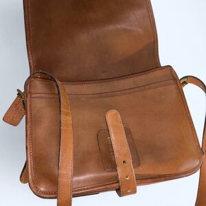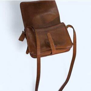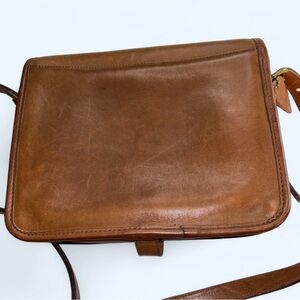 This Coach crossbody bag, crafted from rich brown leather, features a structured design with a front flap closure and an adjustable shoulder strap. The brass hardware adds a touch of sophistication, making it a versatile choice for everyday use.