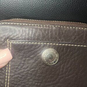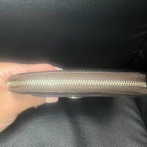 Elegant brown leather wallet. Features a front pocket with stitched detailing. Card holder and snap-change purse. Zip around, soft leather and stylish timeless design.