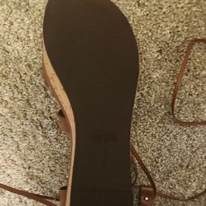 These Coach wedges feature a rich brown leather construction with a stylish lace-up design that wraps around the ankle. The genuine leather offers a warm, natural finish, while the wedge heel provides a comfortable lift for all-day wear. Perfect for casual summer outings, these shoes blend classic gladiator elements with modern flair.