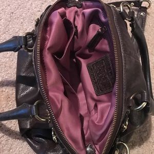Use is slightly evident on the bottom, otherwise the outside leather is in great condition. The inside shows normal evidence of use from contents of the purse, slight stains, no rips or tears.