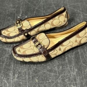 Stylish Coach loafers with a brown monogram design. Features gold buckle accents.