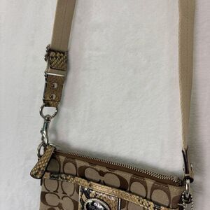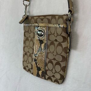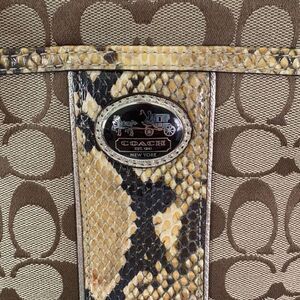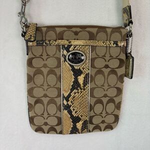 Good condition Coach Brown Monogram with Yellow Snakeskin Detail Crossbody Purse