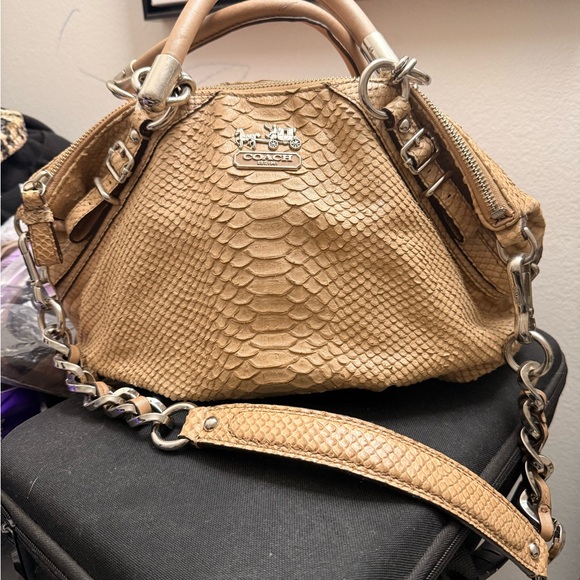 Stylish Coach shoulder bag with python-embossed leather. Features chain strap and signature logo.