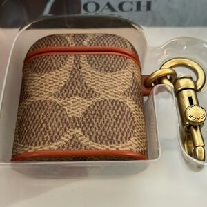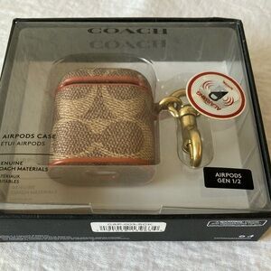 Stylish Coach AirPods case in brown with gold tone accents. Perfect for AirPods Gen 1/2.