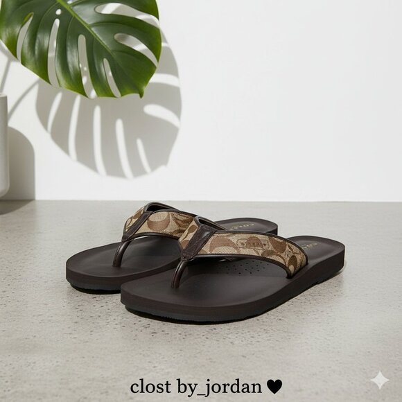 Classic Coach flip flops featuring the iconic brown signature logo strap with a sleek, minimalist design.