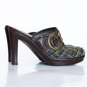 Coach Slip Multi-Color BoucleTweed Upper "CLAUDE" Mules Heels. Made in Italy Size 8.5 B. Brown Leather Strap with Gold Studs & Double Ring Buckle Padded Gold Insoles 4.5" Brown Heels Minor Wear on Soles. One shoe has wear on insole and heel.