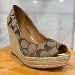 Step out in style with these Coach brown wedge peep-toe shoes. Perfect for any occasion, they offer both comfort and elegance.