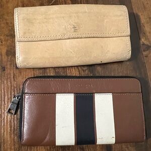 Stylish coach wallet set featuring a brown wallet with white and black stripes and a beige wallet. Perfect for organizing essentials.
