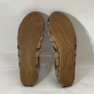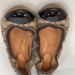 Stylish Coach flats with signature pattern. Brown fabric with black patent leather accents. Comfortable and chic.