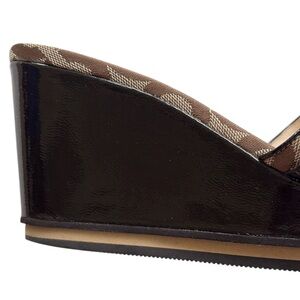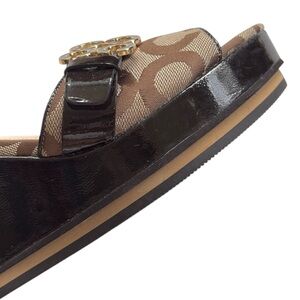 Stylish Coach wedge sandals. Features brown monogram pattern. Accented with black patent leather.