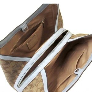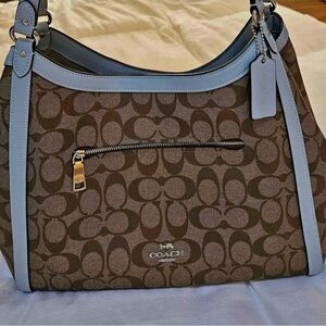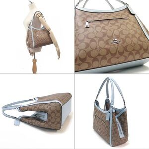 This Coach shoulder bag showcases a sophisticated brown and blue color palette, highlighted by a signature monogram pattern. The hobo-style silhouette and light blue leather trim add a touch of elegance, making it a perfect accessory for any occasion.