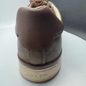 Step into style with Coach's Brown and Cream Suede Sneakers, designed for a sleek and versatile look. These sneakers feature a suede-like upper in a rich brown hue, complemented by a cream sole for a sophisticated contrast. With a low-top cut and minimalist design, they offer both comfort and elegance for any casual occasion. Experience the quality craftsmanship that Coach is known for in every pair.