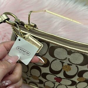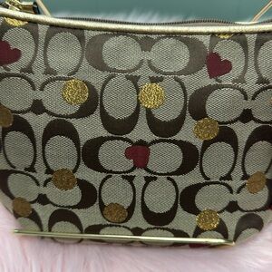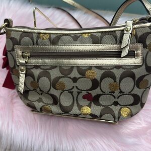 Elegant Coach crossbody bag in brown and gold. Features a charming red bow accent. Ideal for any occasion.