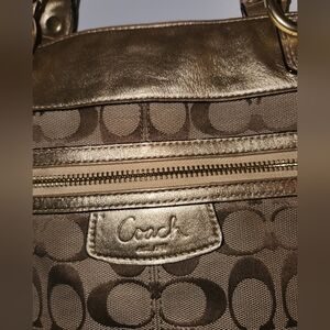 Elegant Coach women's bag in a stylish brown and gold design. Perfect for any occasion. Some marks on inside pocket shown in photos.