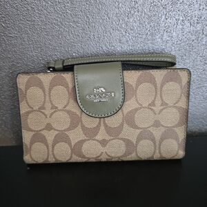 Stylish Coach wristlet in a chic brown and green design. Perfect for keeping essentials close at hand. In very good used condition, see images for more references if the item condition that described the most.This is a pre-owned item and being sold “AS IS” if you have any question regarding this item please add to bundle and a message. I described my items as the best as I could and please see images for more reference of the products. Product color may vary slightly due to photographic lighting sources or your monitor settings.