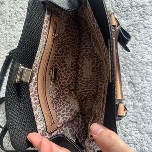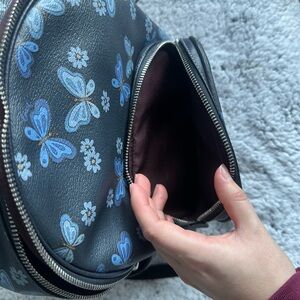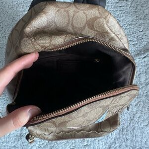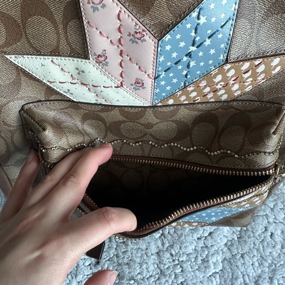 Chic Coach backpack with a brown base and multicolor patchwork. Features floral and star patterns. Ideal for stylish outings.