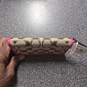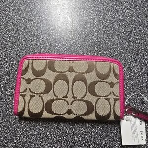 Stylish Coach wallet with brown pattern and pink accents. Perfect for organizing essentials.